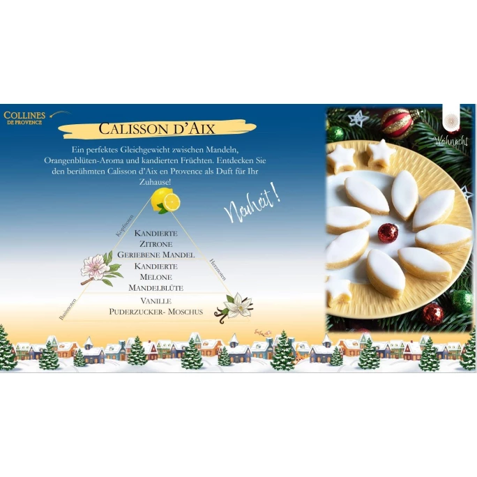 Schaffen Sie sich mit der Kerze Calisson D’Aix aus der Weihnachtskollektion von Collines de Provence ein unvergleichliches Dufterlebnis in Ihrem Zuhause. Die Aromakerze verströmt den leckeren Geruch der berühmten Gourmet-Süßigkeit Calisson d’Aix en Provence. Der Duft überzeugt dabei durch das perfekte Gleichgewicht zwischen Mandeln, Orangenblüten-Aroma und kandierten Früchten. Die Kerze ist von Hand gegossen und aus Duftwachs gefertigt worden. Dieser sorgt dafür, dass die Kerze gleichmäßig schmilzt und der Holzdocht ermöglicht ein sauberes Abbrennen. Die hübsche perforierte Zierblende sorgt zudem für einen dekorativen Laternen-Effekt. Collines de Provence fertigt alle Produkte in der Provence nach handwerklichen Methoden und französischem Know-how. Bei der Auswahl der Duftnoten und der Inhaltstoffe legen sie größten Wert auf Qualität und Natürlichkeit. Das spiegelt sich auch in den Duftkreationen wider. Mit der hochwertigen Duftkerze Calisson D’Aix von Collines de Provence hüllen Sie Ihre Räumlichkeiten in einen weihnachtlichen Wohlgeruch. Wir bieten Ihnen in unserem AMBIENDO Shop weitere Aromakerzen in verschiedenen hochwertigen Duftkompositionen aus dem Hause Collines de Provence an. Lassen Sie sich von den verschiedensten Duftnoten zu jeder Jahreszeit verwöhnen!