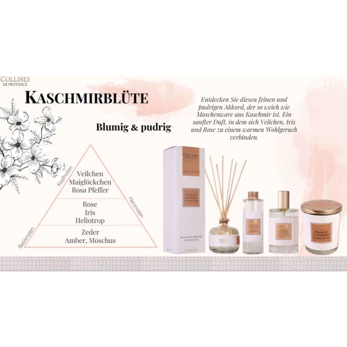 Lassen Sie sich in eine andere Welt fallen und genießen Sie den eleganten Raumduft Couture Kaschmirblüte von Collines de Provence. Er hat einen edlen, pudrigen Akkord, der so weich wie Maschenware aus Kaschmir ist und einen warmen Wohlgeruch verbreitet. Mit dem praktischen Nachfüllduft können Sie Ihren Diffusor beliebig befüllen und Ihr Haus, Büro oder auch jeden anderen Raum immer in eine Wohlfühloase verwandeln. Collines de Provence fertigt alle Produkte in der Provence nach handwerklichen Methoden und französischem Know-how. Bei der Auswahl der Duftnoten und der Inhaltstoffe legen sie größten Wert auf Qualität und Natürlichkeit. Das spiegelt sich auch in den Duftkreationen wider. Sichern Sie sich mit dem Diffusor Nachfüller Couture Kaschmirblüte von Collines de Provence viele wohlriechende Stunden in Ihrem Zuhause. Wir bieten Ihnen in unserem AMBIENDO Shop weitere hochwertige Duftkompositionen aus dem Hause Collines de Provence an. Lassen Sie sich von den verschiedensten Duftnoten verwöhnen!