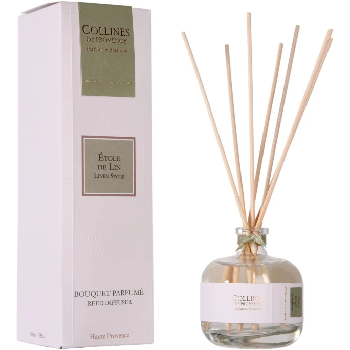 Lassen Sie sich in eine andere Welt fallen und genießen Sie den floralen Raumduft Leinenstola von Collines de Provence. Er verbreitet eine blumige und frische Note, die aus einer harmonischen Kombination von Kräutern sowie Rosen besteht und sie direkt auf ein mit blauen Wiesenblumen übersätes Feld transportiert. Der angenehme Duft schlängelt sich an den Rattan-Stäbchen entlang und sorgt so für eine ständige sowie gleichmäßige Verbreitung Ihrer Lieblingsessenz. Die gewünschte Intensität kann dabei ganz einfach durch die Anzahl der Rattanstäbe beeinflusst werden. Der Diffusor ist nicht nur ein wunderschöner Duftspender, sondern auch ein hochwertiges und dekoratives Wohnaccessoire. Das luxuriöse Design des Flakons ist besonders elegant und veredelt jeden Stil im Nu. Mit dem Raumduft-Diffusor Couture Leinenstola von Collines de Provence sorgen Sie für eine wohlduftende Atmosphäre in Ihrem Zuhause. Collines de Provence fertigt alle Produkte in der Provence nach handwerklichen Methoden und französischem Know-how. Bei der Auswahl der Duftnoten und der Inhaltstoffe legen sie größten Wert auf Qualität und Natürlichkeit. Das spiegelt sich auch in den Duftkreationen wider. Wir bieten Ihnen in unserem AMBIENDO Shop weitere hochwertige Duftkompositionen aus dem Hause Collines de Provence an. Lassen Sie sich von den verschiedensten Duftnoten verwöhnen!
