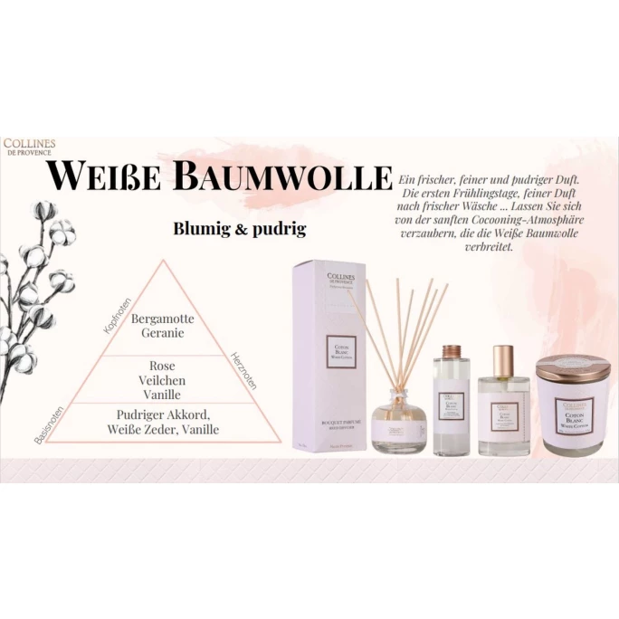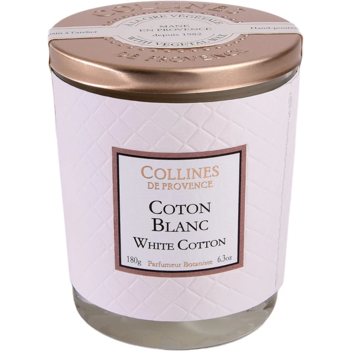 Schaffen Sie sich mit der Kerze Couture Weiße Baumwolle von Collines de Provence ein unvergleichliches Dufterlebnis in Ihrem Zuhause. Sie verbreitet eine blumige und pudrige Note, die an frisch gewaschene Wäsche oder die ersten Frühlingstage erinnert und schafft so eine sanfte Cocooning-Atmosphäre. Die von Hand gegossene und gefertigte Aromakerze besteht aus pflanzlichem Wachs. Sie ist mit einem edlen Deckel in goldrosa, welcher mit einer Prägung und einer handgenähten Banderole verziert ist, ausgestattet. Der Docht aus 100% natürlicher Baumwolle ermöglicht zudem ein sauberes Abbrennen. Collines de Provence fertigt alle Produkte in der Provence nach handwerklichen Methoden und französischem Know-how. Bei der Auswahl der Duftnoten und der Inhaltstoffe legen sie größten Wert auf Qualität und Natürlichkeit. Das spiegelt sich auch in den Duftkreationen wider. Mit der hochwertigen Duftkerze Couture Weiße Baumwolle von Collines de Provence hüllen Sie Ihre Räumlichkeiten in einen angenehmen, frischen Wohlgeruch. Wir bieten Ihnen in unserem AMBIENDO Shop weitere Aromakerzen in verschiedenen hochwertigen Duftkompositionen aus dem Hause Collines de Provence an. Lassen Sie sich von den verschiedensten Duftnoten verwöhnen!