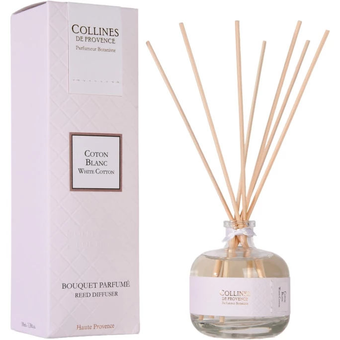 Lassen Sie sich in eine andere Welt fallen und genießen Sie den harmonischen Raumduft Couture Weiße Baumwolle von Collines de Provence. Er verbreitet eine blumige und pudrige Note, die an frisch gewaschene Wäsche oder die ersten Frühlingstage erinnert und schafft so eine sanfte Cocooning-Atmosphäre. Der zarte Duft schlängelt sich an den Rattan-Stäbchen entlang und sorgt so für eine ständige sowie gleichmäßige Verbreitung Ihrer Lieblingsessenz. Die gewünschte Intensität kann dabei ganz einfach durch die Anzahl der Rattanstäbe beeinflusst werden. Der Diffusor ist nicht nur ein wunderschöner Duftspender, sondern auch ein hochwertiges und dekoratives Wohnaccessoire. Das luxuriöse Design des Flakons ist besonders elegant und veredelt jeden Stil im Nu. Mit dem Raumduft-Diffusor Couture Weiße Baumwolle von Collines de Provence sorgen Sie für eine wohlduftende Atmosphäre in Ihrem Zuhause. Collines de Provence fertigt alle Produkte in der Provence nach handwerklichen Methoden und französischem Know-how. Bei der Auswahl der Duftnoten und der Inhaltstoffe legen sie größten Wert auf Qualität und Natürlichkeit. Das spiegelt sich auch in den Duftkreationen wider. Wir bieten Ihnen in unserem AMBIENDO Shop weitere hochwertige Duftkompositionen aus dem Hause Collines de Provence an. Lassen Sie sich von den verschiedensten Duftnoten verwöhnen!