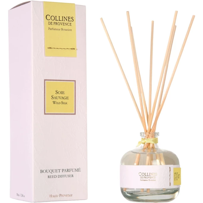 Lassen Sie sich in eine andere Welt fallen und genießen Sie den floralen Raumduft Wildseide von Collines de Provence. Sein blumiges Herz ist so sanft wie ein Seidenschleier, dem eine Kombination aus Vanille und Moschus folgt, wodurch eine harmonische Atmosphäre geschafften wird. Der betörende Duft schlängelt sich an den Rattan-Stäbchen entlang und sorgt so für eine ständige sowie gleichmäßige Verbreitung Ihrer Lieblingsessenz. Die gewünschte Intensität kann dabei ganz einfach durch die Anzahl der Rattanstäbe beeinflusst werden. Der Diffusor ist nicht nur ein wunderschöner Duftspender, sondern auch ein hochwertiges und dekoratives Wohnaccessoire. Das luxuriöse Design des Flakons ist besonders elegant und veredelt jeden Stil im Nu. Mit dem Raumduft-Diffusor Wildseide von Collines de Provence sorgen Sie für eine wohlduftende Atmosphäre in Ihrem Zuhause. Collines de Provence fertigt alle Produkte in der Provence nach handwerklichen Methoden und französischem Know-how. Bei der Auswahl der Duftnoten und der Inhaltstoffe legen sie größten Wert auf Qualität und Natürlichkeit. Das spiegelt sich auch in den Duftkreationen wider. Wir bieten Ihnen in unserem AMBIENDO Shop weitere hochwertige Duftkompositionen aus dem Hause Collines de Provence an. Lassen Sie sich von den verschiedensten Duftnoten verwöhnen!