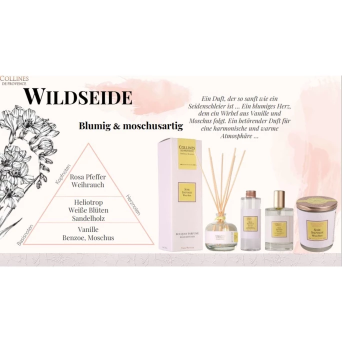 Sorgen Sie mit dem floralen Raumspray Couture Wildseide von Collines de Provence für ein unvergleichliches Dufterlebnis in Ihrem Zuhause. Das blumige Herz ist so sanft wie ein Seidenschleier, dem eine Kombination aus Vanille und Moschus folgt, wodurch eine harmonische Atmosphäre geschafften wird. Mit dem aromatischen Spray können Sie Ihr Haus, Büro oder jeden anderen Raum in eine duftende Wohlfühloase verwandeln. Die Sprühflasche ist handlich sowie einfach zu benutzen und verströmt schnell einen angenehmen Duft. Collines de Provence fertigt alle Produkte in der Provence nach handwerklichen Methoden und französischem Know-how. Bei der Auswahl der Duftnoten und der Inhaltstoffe legen sie größten Wert auf Qualität und Natürlichkeit. Das spiegelt sich auch in den Duftkreationen wider. Mit dem Raumspray Couture Wildseide von Collines de Provence sorgen Sie für eine wohlriechende Atmosphäre in Ihrem Zuhause. Wir bieten Ihnen in unserem AMBIENDO Shop weitere hochwertige Duftkompositionen aus dem Hause Collines de Provence an. Lassen Sie sich von den verschiedensten Duftnoten verwöhnen!