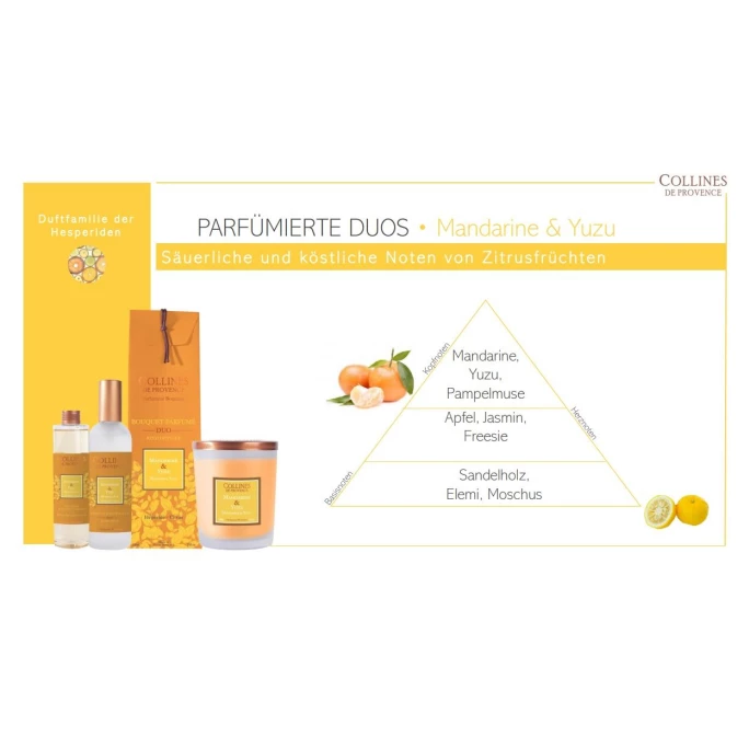 Sorgen Sie mit dem spritzigen Raumspray Duos Parfumés Mandarine & Yuzu von Collines de Provence für ein unvergleichliches Dufterlebnis in Ihrem Zuhause. Er überzeugt durch einen Akkord aus säuerlichen Noten und üppigen Akzenten von frischen Zitrusfrüchten. Hierfür wurden geriebene Schalen vollreifer Mandarinen mit dem intensiv prickelnden Yuzu kombiniert. Mit dem aromatischen Spray können Sie Ihr Haus, Büro oder jeden anderen Raum in eine duftende Wohlfühloase verwandeln. Die Sprühflasche ist handlich sowie einfach zu benutzen und verströmt schnell einen angenehmen Duft. Collines de Provence fertigt alle Produkte in der Provence nach handwerklichen Methoden und französischem Know-how. Bei der Auswahl der Duftnoten und der Inhaltstoffe legen sie größten Wert auf Qualität und Natürlichkeit. Das spiegelt sich auch in den Duftkreationen wider. Mit dem Raumspray Duos Parfumés Mandarine & Yuzu von Collines de Provence sorgen Sie für eine frische und wohlriechende Atmosphäre in Ihrem Zuhause. Wir bieten Ihnen in unserem AMBIENDO Shop weitere hochwertige Duftkompositionen aus dem Hause Collines de Provence an. Lassen Sie sich von den verschiedensten Duftnoten verwöhnen!