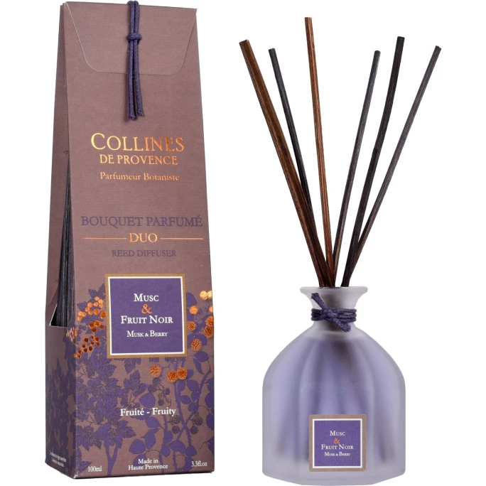 Lassen Sie sich in eine andere Welt fallen und genießen Sie den extravaganten Raumduft Duos Parfumés Moschus & Beere von Collines de Provence. Er überzeugt durch seine feine, holzige sowie fruchtige Note von weißem Moschus, welche sich mit dem süßlichen Gourmetakkord der Brombeere vereint. Der angenehme Duft schlängelt sich an den Rattan-Stäbchen entlang und sorgt so für eine ständige sowie gleichmäßige Verbreitung Ihrer Lieblingsessenz. Die gewünschte Intensität kann dabei ganz einfach durch die Anzahl der Rattanstäbe beeinflusst werden. Der Diffusor ist nicht nur ein wunderschöner Duftspender, sondern auch ein hochwertiges und dekoratives Wohnaccessoire. Das luxuriöse Design des Flakons ist besonders elegant und veredelt jeden Stil im Nu. Mit dem Raumduft-Diffusor Duos Parfumés Moschus & Beere von Collines de Provence sorgen Sie für eine wohlduftende Atmosphäre in Ihrem Zuhause. Collines de Provence fertigt alle Produkte in der Provence nach handwerklichen Methoden und französischem Know-how. Bei der Auswahl der Duftnoten und der Inhaltstoffe legen sie größten Wert auf Qualität und Natürlichkeit. Das spiegelt sich auch in den Duftkreationen wider. Wir bieten Ihnen in unserem AMBIENDO Shop weitere hochwertige Duftkompositionen aus dem Hause Collines de Provence an. Lassen Sie sich von den verschiedensten Duftnoten verwöhnen!
