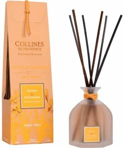 Lassen Sie sich in eine andere Welt fallen und genießen Sie den würzigen Raumduft Duos Parfumés Safran & Ingwer von Collines de Provence. Er überzeugt durch einen perfekt gelungenen Akkord, in dem sich der kräftige Safran und der frische Ingwer regelrecht ineinander verschmelzen. Der extravagante Duft schlängelt sich an den Rattan-Stäbchen entlang und sorgt so für eine ständige sowie gleichmäßige Verbreitung Ihrer Lieblingsessenz. Die gewünschte Intensität kann dabei ganz einfach durch die Anzahl der Rattanstäbe beeinflusst werden. Der Diffusor ist nicht nur ein wunderschöner Duftspender, sondern auch ein hochwertiges und dekoratives Wohnaccessoire. Das luxuriöse Design des Flakons ist besonders elegant und veredelt jeden Stil im Nu. Mit dem Raumduft-Diffusor Duos Parfumés Safran & Ingwer von Collines de Provence sorgen Sie für eine wohlduftende Atmosphäre in Ihrem Zuhause. Collines de Provence fertigt alle Produkte in der Provence nach handwerklichen Methoden und französischem Know-how. Bei der Auswahl der Duftnoten und der Inhaltstoffe legen sie größten Wert auf Qualität und Natürlichkeit. Das spiegelt sich auch in den Duftkreationen wider. Wir bieten Ihnen in unserem AMBIENDO Shop weitere hochwertige Duftkompositionen aus dem Hause Collines de Provence an. Lassen Sie sich von den verschiedensten Duftnoten verwöhnen!