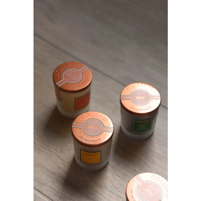 Schaffen Sie sich mit der Kerze Duos Parfumés Vanille-Grapefruit von Collines de Provence ein unvergleichliches Dufterlebnis in Ihrem Zuhause. Er überzeugt durch eine einzigartige Harmonie zwischen Pampelmuse und den floralen wie süffigen Noten von Jasmin sowie Vanille. Die Aromakerze besteht aus pflanzlichem, farbigen Wachs und ist mit einem Deckel aus kupferfarbeinem Aluminium ausgestattet. Der Docht aus 100% natürlicher Baumwolle ermöglicht zudem ein sauberes Abbrennen. Collines de Provence fertigt alle Produkte in der Provence nach handwerklichen Methoden und französischem Know-how. Bei der Auswahl der Duftnoten und der Inhaltstoffe legen sie größten Wert auf Qualität und Natürlichkeit. Das spiegelt sich auch in den Duftkreationen wider. Mit der hochwertigen Duftkerze Duos Parfumés Vanille-Grapefruit von Collines de Provence hüllen Sie Ihre Räumlichkeiten in angenehmen Wohlgeruch. Wir bieten Ihnen in unserem AMBIENDO Shop weitere Aromakerzen in verschiedenen hochwertigen Duftkompositionen aus dem Hause Collines de Provence an. Lassen Sie sich von den verschiedensten Duftnoten verwöhnen!