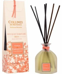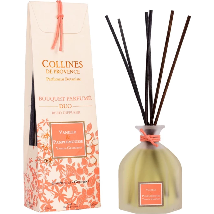 Lassen Sie sich in eine andere Welt fallen und genießen Sie den üppigen Raumduft Duos Parfumés Vanille-Grapefruit von Collines de Provence. Er überzeugt durch die einzigartige Harmonie zwischen Pampelmuse und den floralen wie süffigen Noten von Jasmin sowie Vanille. Der umwerfende Duft schlängelt sich an den Rattan-Stäbchen entlang und sorgt so für eine ständige sowie gleichmäßige Verbreitung Ihrer Lieblingsessenz. Die gewünschte Intensität kann dabei ganz einfach durch die Anzahl der Rattanstäbe beeinflusst werden. Der Diffusor ist nicht nur ein wunderschöner Duftspender, sondern auch ein hochwertiges und dekoratives Wohnaccessoire. Das luxuriöse Design des Flakons ist besonders elegant und veredelt jeden Stil im Nu. Mit dem Raumduft-Diffusor Duos Parfumés Vanille-Grapefruit von Collines de Provence sorgen Sie für eine wohlduftende Atmosphäre in Ihrem Zuhause. Collines de Provence fertigt alle Produkte in der Provence nach handwerklichen Methoden und französischem Know-how. Bei der Auswahl der Duftnoten und der Inhaltstoffe legen sie größten Wert auf Qualität und Natürlichkeit. Das spiegelt sich auch in den Duftkreationen wider. Wir bieten Ihnen in unserem AMBIENDO Shop weitere hochwertige Duftkompositionen aus dem Hause Collines de Provence an. Lassen Sie sich von den verschiedensten Duftnoten verwöhnen!