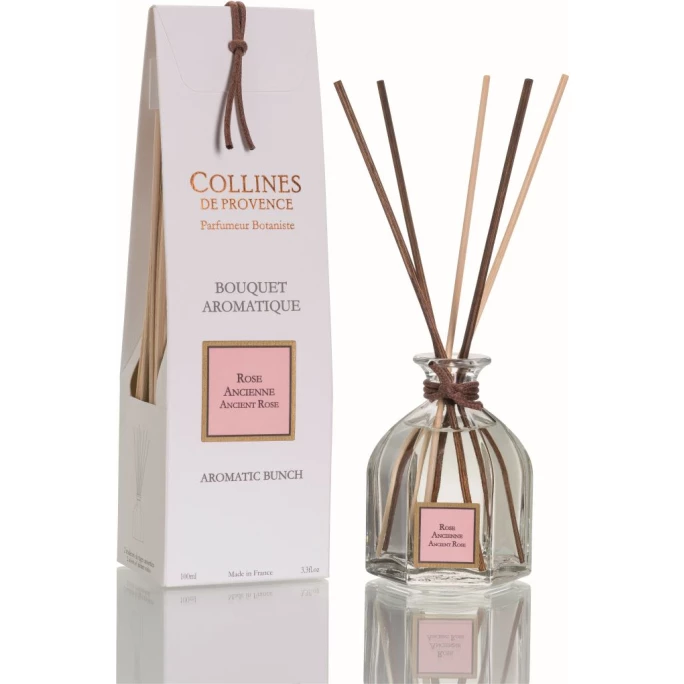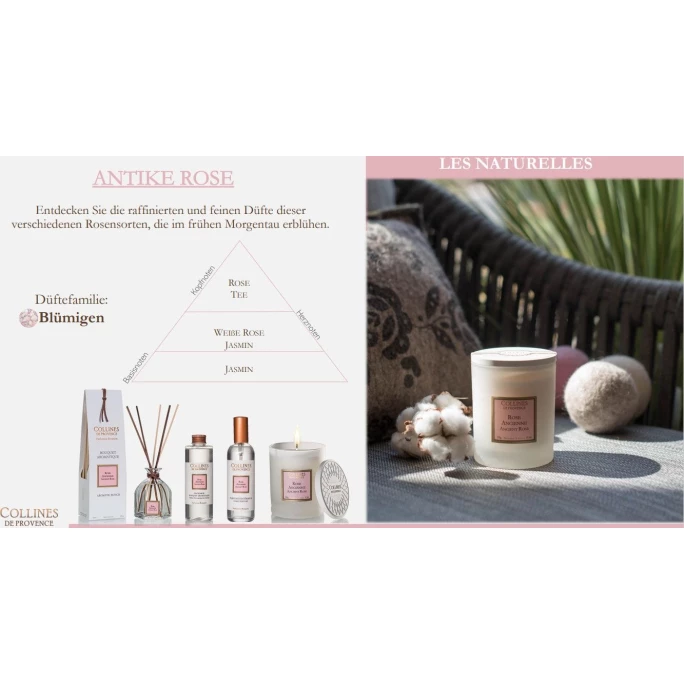 Lassen Sie sich in eine andere Welt fallen und genießen Sie den floralen Raumduft Les Naturelles Antike Rose von Collines de Provence. Es ist ein raffinierter und feiner Duft aus verschiedenen Rosensorten, die im frühen Morgentau erblühen und mit einer leichten Jasminnote verschmelzen. Der frische Duft schlängelt sich an den Rattan-Stäbchen entlang und sorgt so für eine ständige sowie gleichmäßige Verbreitung Ihrer Lieblingsessenz. Die gewünschte Intensität kann dabei ganz einfach durch die Anzahl der Rattanstäbe beeinflusst werden. Der sechseckige Diffusor ist nicht nur ein wunderschöner Duftspender, sondern auch ein hochwertiges und dekoratives Wohnaccessoire. Das luxuriöse Design des Flakons ist besonders elegant und veredelt jeden Stil im Nu. Mit dem Raumduft-Diffusor Les Naturelles Antike Rose von Collines de Provence sorgen Sie für eine wohlduftende Atmosphäre in Ihrem Zuhause. Collines de Provence fertigt alle Produkte in der Provence nach handwerklichen Methoden und französischem Know-how. Bei der Auswahl der Duftnoten und der Inhaltstoffe legen sie größten Wert auf Qualität und Natürlichkeit. Das spiegelt sich auch in den Duftkreationen wider. Wir bieten Ihnen in unserem AMBIENDO Shop weitere hochwertige Duftkompositionen aus dem Hause Collines de Provence an. Lassen Sie sich von den verschiedensten Duftnoten verwöhnen!