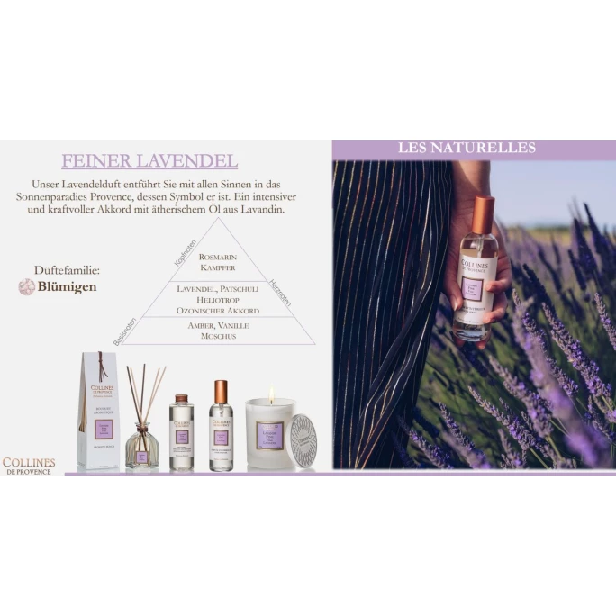 Lassen Sie sich in eine andere Welt fallen und genießen Sie den floralen Raumduft Les Naturelles Feiner Lavendel von Collines de Provence. Er besticht durch einen intensiven und kraftvollen Akkord mit ätherischem Öl aus Lavandin und entführt Sie mit allen Sinnen in das Sonnenparadies Provence. Mit dem praktischen Nachfüllduft können Sie Ihren Diffusor beliebig befüllen und Ihr Haus, Büro oder auch jeden anderen Raum immer in eine Wohlfühloase verwandeln. Collines de Provence fertigt alle Produkte in der Provence nach handwerklichen Methoden und französischem Know-how. Bei der Auswahl der Duftnoten und der Inhaltstoffe legen sie größten Wert auf Qualität und Natürlichkeit. Das spiegelt sich auch in den Duftkreationen wider. Sichern Sie sich mit dem Diffusor Nachfüller Les Naturelles Feiner Lavendel von Collines de Provence viele betörende, wohlriechende Stunden in Ihrem Zuhause. Wir bieten Ihnen in unserem AMBIENDO Shop weitere hochwertige Duftkompositionen aus dem Hause Collines de Provence an. Lassen Sie sich von den verschiedensten Duftnoten verwöhnen!