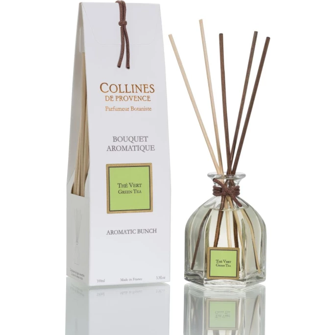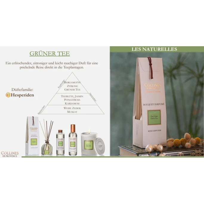 Lassen Sie sich in eine andere Welt fallen und genießen Sie den spritzigen Raumduft Les Naturelles Grüner Tee von Collines de Provence. Es ist ein erfrischender, zitroniger und leicht rauchiger Duft, der Sie auf eine spannende Reise direkt in die Teeplantagen entführt. Der prickelnde Duft schlängelt sich an den Rattan-Stäbchen entlang und sorgt so für eine ständige sowie gleichmäßige Verbreitung Ihrer Lieblingsessenz. Die gewünschte Intensität kann dabei ganz einfach durch die Anzahl der Rattanstäbe beeinflusst werden. Der sechseckige Diffusor ist nicht nur ein wunderschöner Duftspender, sondern auch ein hochwertiges und dekoratives Wohnaccessoire. Das luxuriöse Design des Flakons ist besonders elegant und veredelt jeden Stil im Nu. Mit dem Raumduft-Diffusor Les Naturelles Grüner Tee von Collines de Provence sorgen Sie für eine wohlduftende Atmosphäre in Ihrem Zuhause. Collines de Provence fertigt alle Produkte in der Provence nach handwerklichen Methoden und französischem Know-how. Bei der Auswahl der Duftnoten und der Inhaltstoffe legen sie größten Wert auf Qualität und Natürlichkeit. Das spiegelt sich auch in den Duftkreationen wider. Wir bieten Ihnen in unserem AMBIENDO Shop weitere hochwertige Duftkompositionen aus dem Hause Collines de Provence an. Lassen Sie sich von den verschiedensten Duftnoten verwöhnen!
