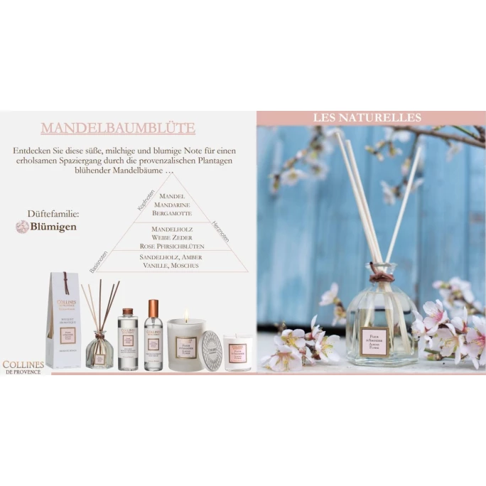 Lassen Sie sich in eine andere Welt fallen und genießen Sie den floralen Raumduft Les Naturelles Mandelbaumblüte von Collines de Provence. Er besticht durch seine süße, milchige sowie blumige Note und nimmt Sie mit auf einen erholsamen Spaziergang durch die provenzalischen Plantagen blühender Mandelbäume. Mit dem praktischen Nachfüllduft können Sie Ihren Diffusor beliebig befüllen und Ihr Haus, Büro oder auch jeden anderen Raum immer in eine Wohlfühloase verwandeln. Collines de Provence fertigt alle Produkte in der Provence nach handwerklichen Methoden und französischem Know-how. Bei der Auswahl der Duftnoten und der Inhaltstoffe legen sie größten Wert auf Qualität und Natürlichkeit. Das spiegelt sich auch in den Duftkreationen wider. Sichern Sie sich mit dem Diffusor Nachfüller Les Naturelles Mandelbaumblüte von Collines de Provence viele angenehme, wohlriechende Stunden in Ihrem Zuhause. Wir bieten Ihnen in unserem AMBIENDO Shop weitere hochwertige Duftkompositionen aus dem Hause Collines de Provence an. Lassen Sie sich von den verschiedensten Duftnoten verwöhnen!