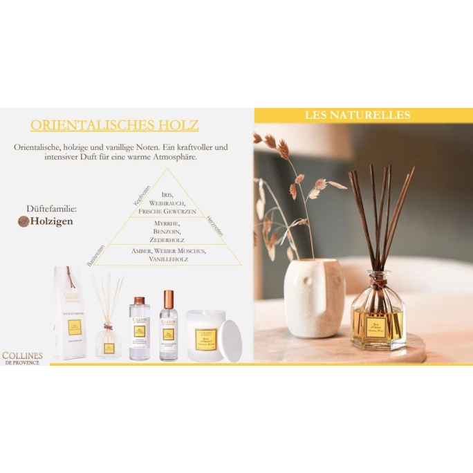 Sorgen Sie mit dem extravaganten Raumspray Les Naturelles Orientalisches Holz von Collines de Provence für ein unvergleichliches Dufterlebnis in Ihrem Zuhause. Der intensive Duft überzeugt durch seine orientalische, holzige und vanillige Note und sorgt für eine warme Atmosphäre. Mit dem aromatischen Spray können Sie Ihr Haus, Büro oder jeden anderen Raum in eine duftende Wohlfühloase verwandeln. Die Sprühflasche ist handlich sowie einfach zu benutzen und verströmt schnell einen angenehmen Duft. Collines de Provence fertigt alle Produkte in der Provence nach handwerklichen Methoden und französischem Know-how. Bei der Auswahl der Duftnoten und der Inhaltstoffe legen sie größten Wert auf Qualität und Natürlichkeit. Das spiegelt sich auch in den Duftkreationen wider. Mit dem Raumspray Les Naturelles Orientalisches Holz von Collines de Provence sorgen Sie für eine betörende und wohlriechende Atmosphäre in Ihrem Zuhause. Wir bieten Ihnen in unserem AMBIENDO Shop weitere hochwertige Duftkompositionen aus dem Hause Collines de Provence an. Lassen Sie sich von den verschiedensten Duftnoten verwöhnen!