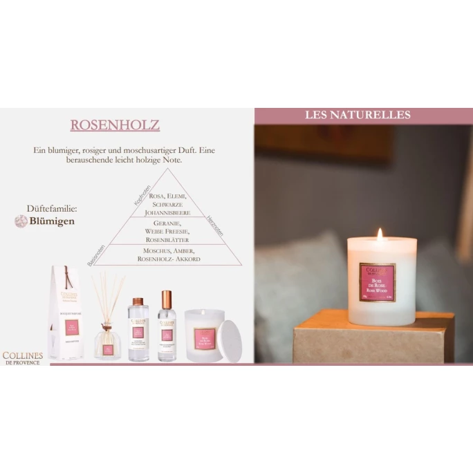 Lassen Sie sich in eine andere Welt fallen und genießen Sie den floralen Raumduft Les Naturelles Rosenholz von Collines de Provence. Es ist ein blumiger, rosiger und moschusartiger Duft, der sich mit einer berauschenden, leicht holzigen Note vereint und für ein besonderes Dufterlebnis sorgt. Mit dem praktischen Nachfüllduft können Sie Ihren Diffusor beliebig befüllen und Ihr Haus, Büro oder auch jeden anderen Raum immer in eine Wohlfühloase verwandeln. Collines de Provence fertigt alle Produkte in der Provence nach handwerklichen Methoden und französischem Know-how. Bei der Auswahl der Duftnoten und der Inhaltstoffe legen sie größten Wert auf Qualität und Natürlichkeit. Das spiegelt sich auch in den Duftkreationen wider. Sichern Sie sich mit dem Diffusor Nachfüller Les Naturelles Rosenholz von Collines de Provence viele angenehme, wohlriechende Stunden in Ihrem Zuhause. Wir bieten Ihnen in unserem AMBIENDO Shop weitere hochwertige Duftkompositionen aus dem Hause Collines de Provence an. Lassen Sie sich von den verschiedensten Duftnoten verwöhnen!