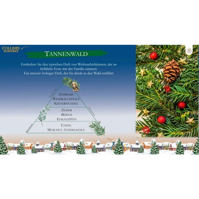 Schaffen Sie sich mit der Kerze Tannenwald aus der Weihnachtskollektion von Collines de Provence ein unvergleichliches Dufterlebnis in Ihrem Zuhause. Die Aromakerze überzeugt durch den intensiven, holzigen Duft, welcher Sie direkt in die Wälder entführt und die Kraft der Nadelbäume spüren lässt. Die Kerze ist von Hand gegossen und aus Duftwachs gefertigt worden. Dieser sorgt dafür, dass die Kerze gleichmäßig schmilzt und der Holzdocht ermöglicht ein sauberes Abbrennen. Die hübsche perforierte Zierblende sorgt zudem für einen dekorativen Laternen-Effekt. Collines de Provence fertigt alle Produkte in der Provence nach handwerklichen Methoden und französischem Know-how. Bei der Auswahl der Duftnoten und der Inhaltstoffe legen sie größten Wert auf Qualität und Natürlichkeit. Das spiegelt sich auch in den Duftkreationen wider. Mit der hochwertigen Duftkerze Tannenwald von Collines de Provence hüllen Sie Ihre Räumlichkeiten in einen weihnachtlichen Wohlgeruch. Wir bieten Ihnen in unserem AMBIENDO Shop weitere Aromakerzen in verschiedenen hochwertigen Duftkompositionen aus dem Hause Collines de Provence an. Lassen Sie sich von den verschiedensten Duftnoten zu jeder Jahreszeit verwöhnen!