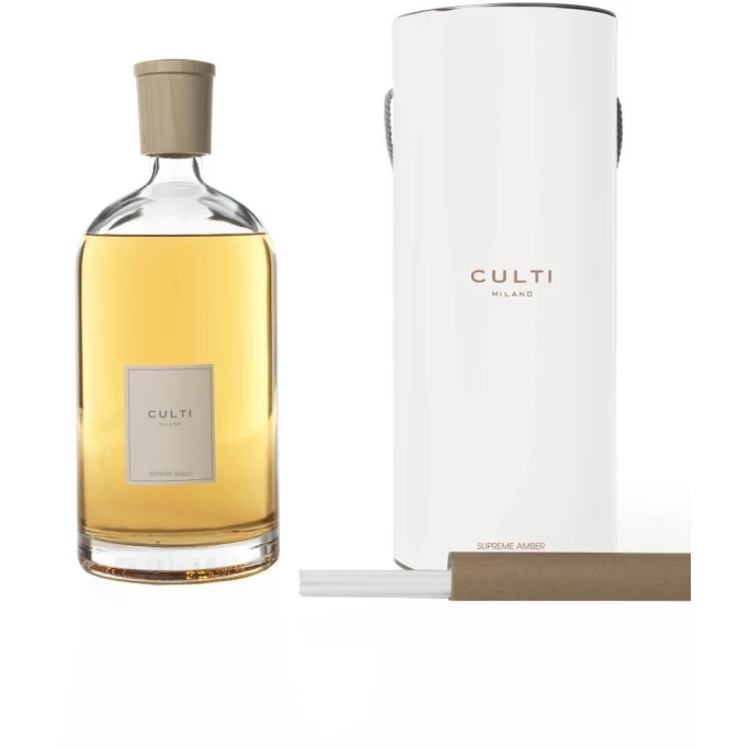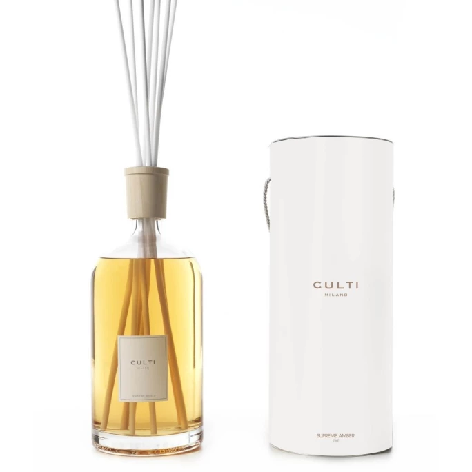 Denken Sie an warme Abende im Spätsommer und erinnern Sie sich an eine wundervolle Zeit mit Freunden und Familie auf der Terasse oder im Garten. Der östlich angehauchte Raumduft Supreme Amber von CULTI bringt Sie zurück an diesen Ort und umhüllt Sie mit sinnlicher Eleganz und den rauchigen Duftnoten von Weihrauch und Patchouli kombiniert mit Zitrusnoten aus Zistrose und Bitterorange und dem süßen Duft von schwarzer Vanille. Genießen Sie die Erinnerungen, die dieser Duft in Ihnen weckt oder die Vorstellungen die Sie haben. Der Diffusor von Culti ist nicht nur ein wunderschöner Duftspender, sondern auch ein besonders hochwertiges und stilvolles Wohnaccessoire, welches sehr dekorativ jeden Raum ausschmückt. Der feine Duft schlängelt sich an den Rattan-Stäbchen entlang und erfrischt jeden Raum mit Ihrer Lieblingsessenz! Das luxuriöse braun-transparente Design des Flakons ist besonders elegant und veredelt jeden Stil im Nu.