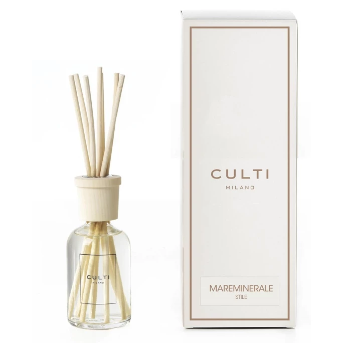 Eine zarte Briese an Meeresdüften – dieser Duft riecht wahrlich wie ein Sonnenaufgang am Strand. Genießen Sie die wundervollen Erinnerungen, die von dem Wellness-Duft Stile Classic Mareminerale von CULTI bei Ihnen geweckt werden. Der Raumduft besitzt eine ionisierende Energie und erhellt jeden Raum frisch und herb. Culti Milano hat den perfekten Duft des Wohlbefindens kreiert und stellt Ihnen diesen zur Verfügung! Der Diffusor von Culti ist nicht nur ein wunderschöner Duftspender, sondern auch ein besonders hochwertiges und stilvolles Wohnaccessoire, welches sehr dekorativ jeden Raum ausschmückt. Der feine Duft schlängelt sich an den Rattan-Stäbchen entlang und erfrischt jeden Raum mit Ihrer Lieblingsessenz! Das luxuriöse braun-transparente Design des Flakons ist besonders elegant und veredelt jeden Stil im Nu.