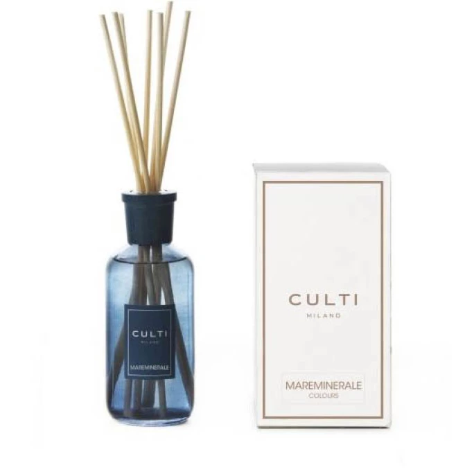 Eine zarte Brise an Meeresdüften – dieser Duft riecht wahrlich wie ein Sonnenaufgang am Strand. Genießen Sie die wundervollen Erinnerungen, die von dem Raumduft-Diffusor Stile Colours blue Mareminerale von CULTI bei Ihnen geweckt werden. Die frische, herbe Duftnote aus Meeres-Akkorden und mineralischem Moschus besitzt eine ionisierende Energie und erhellt jeden Raum. CULTI hat den perfekten Duft des Wohlbefindens kreiert. Der Diffusor ist nicht nur ein wunderschöner Duftspender, sondern auch ein besonders hochwertiges und dekoratives Wohnaccessoire. Das klare farbige Design des Flakons und der blaue Ahorn-Verschluss veredeln jeden Stil im Nu. Der feine Duft schlängelt sich an den Rattan-Stäbchen entlang und erfrischt jeden Raum mit Ihrer Lieblingsessenz! Verwandeln Sie Ihr Zuhause mit dem Raumduft-Diffusor Stile Colours blue Mareminerale von CULTI in eine Wohlfühloase. Wir bieten Ihnen in unserem AMBIENDO Shop weitere betörende Duftkompositionen in verschiedenen Flakongrößen von der Luxusmarke CULTI an. Lassen Sie sich von den verschiedensten Duftnoten verwöhnen. Diese können Ihre Stimmung beeinflussen. Je nach gewählter Duftrichtung kann es belebend, entspannend, stimulierend oder beruhigend wirken. Probieren Sie es aus!