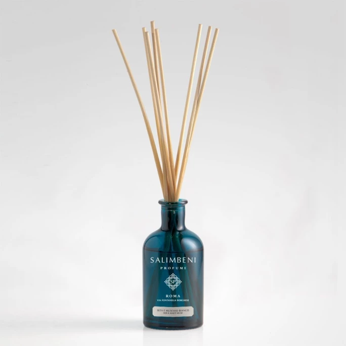 Ein raffiniertes Geschenk, ein hochwertiges und intelligentes Produkt: Ohne Strom oder Verbrennung verbreitet der SETA E MUSCHIO BIANCO Raumduft ein wundervolles Dufterlebnis in Ihrem Zuhause. Der italienische Hersteller Salimbeni-Parfüms verwendet ausschließlich in Italien hergestellte Parfüms und verzichtet dabei auf den Zusatz von Farbstoffen. In dem eleganten Glasflakon befinden sich nur hochwertigste Duftessenzen, die über die mitgelieferten Bambusstäbchen gleichmäßig in die Raumluft verteilt werden. SETA E MUSCHIO BIANCO: Sofort entsteht ein Gefühl von Frische und Leichtigkeit. Die Noten von Ingwer, Zimt und Pflaume geben dem Parfüm einen festen Duftkörper und unterstreichen den sanften Geruch der weichen Blütenblätter von Magnolie, Kamelie und Pfirsichblüte. Der 100 ml fassende SETA E MUSCHIO BIANCO Raumduft wird in einer hochwertigen Holz-Geschenkverpackung geliefert und ist für kleine Umgebungen wie Schreibtische oder das Gäste-WC geeignet. Je nach Temperatur- und Feuchtigkeitsbedingungen verbreitet das Salimbeni Raumparfüm bis zu 8 Wochen einen frischen und belebenden Duft. Gönnen Sie sich etwas Besonderes und betören Ihre Sinne mit dem SETA E MUSCHIO BIANCO Raumduft von Salimbeni.